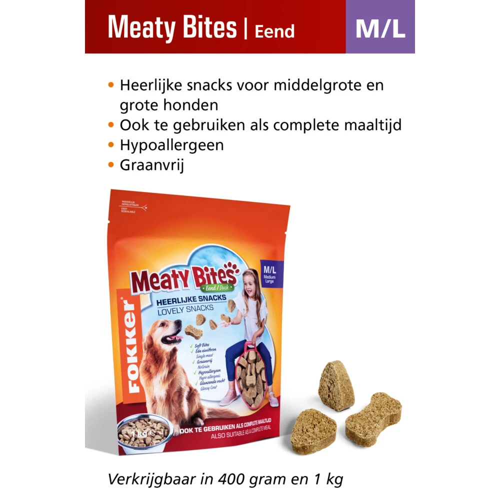 Fokker Meaty Bites Medium – LargeDe Fokker Meaty Bites zijn een heerlijke snack en beloning voor je hond. De snacks zijn goed geschikt voor training en opvoeding maar uiteraard ook als heerlijk verwen momentje tussendoor. Het fijne aan de Meaty Bites is dat de snacks slechts uit één eiwitbron bestaan: eend. Darnaast zijn de snacks ook graanvrij. Een ideale snack voor de gewone maar ook voor de gevoelige hond. Eén eiwitbronGraanvrijHypoallergeenGlanzende vacht