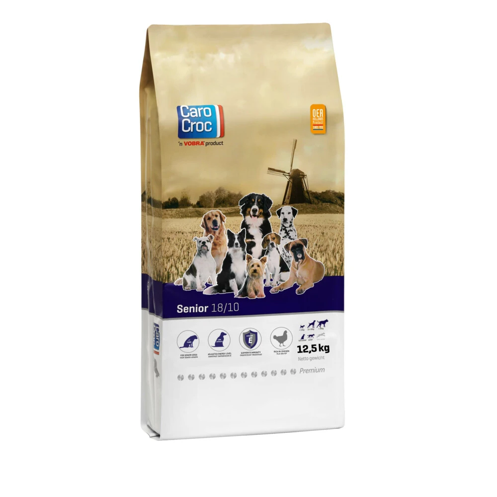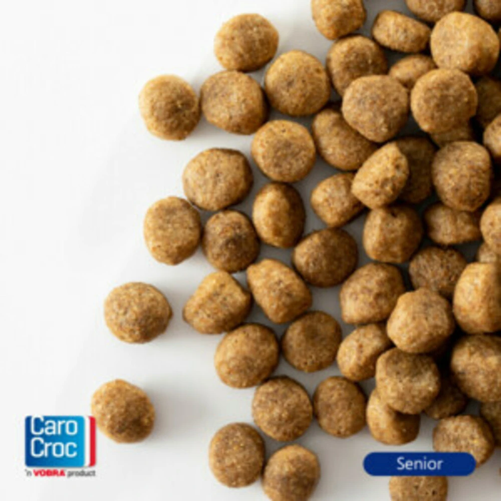 CaroCroc Hondenvoer Senior 18/10CaroCroc Senior voeding is speciaal afgestemd op jouw senior hond. Vanaf 7 jaar kan jouw hond verouderingsverschijnselen vertonen. De stofwisseling gaat trager werken en het activiteitsniveau kan afnemen. Dit betekenr dat de energiebehoefte van jouw hond verandert. Het is belangrijk om het voer hierop aan te passen. Naast het aanpassen van het eiwit- en vetgehalte in het voer, om problemen als overgewicht te voorkomen, bevat de CaroCroc Senior brok ook Omega