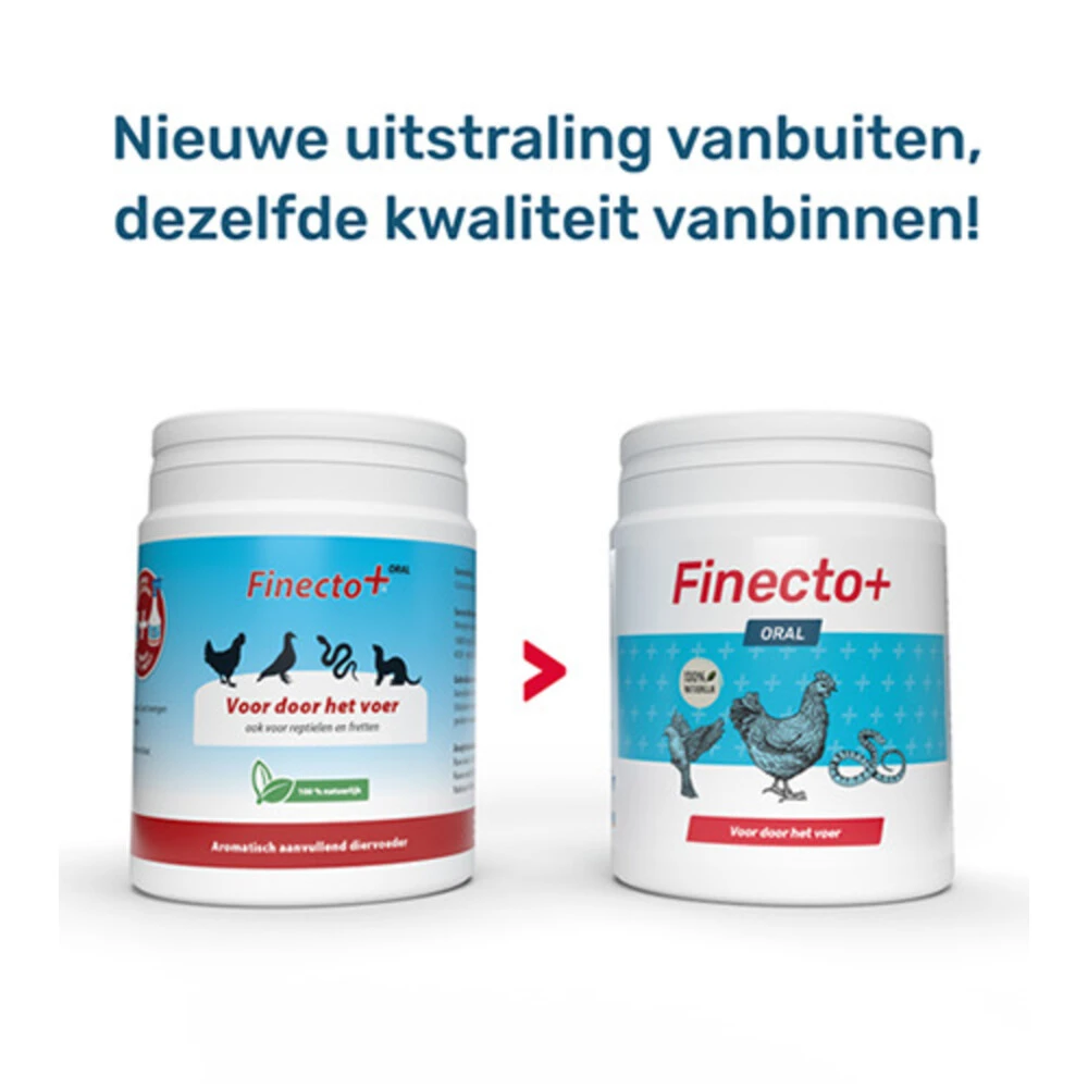 Finecto+ Oral BloedluisFinecto+ Oral is een 100% natuurlijk aanvullend diervoeder op basis van aromatische stoffen voor pluimvee, vogels en reptielen. Finecto+ Oral geeft een zeer krachtige, langdurige geurverandering aan deze dieren. Finecto+ Oral door het voer zorgt ervoor dat het bloed onaantrekkelijk en onverteerbaar wordt. Het maakt tevens pluimvee, vogels en reptielen minder stressgevoelig en ondersteunt een gezond vederkleed. Bevat geen chemische stoffen.Finecto+ Oral is eenvoudig te meng