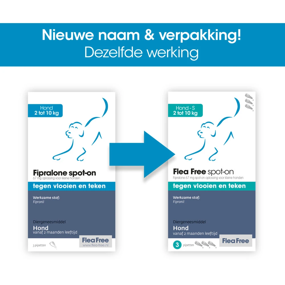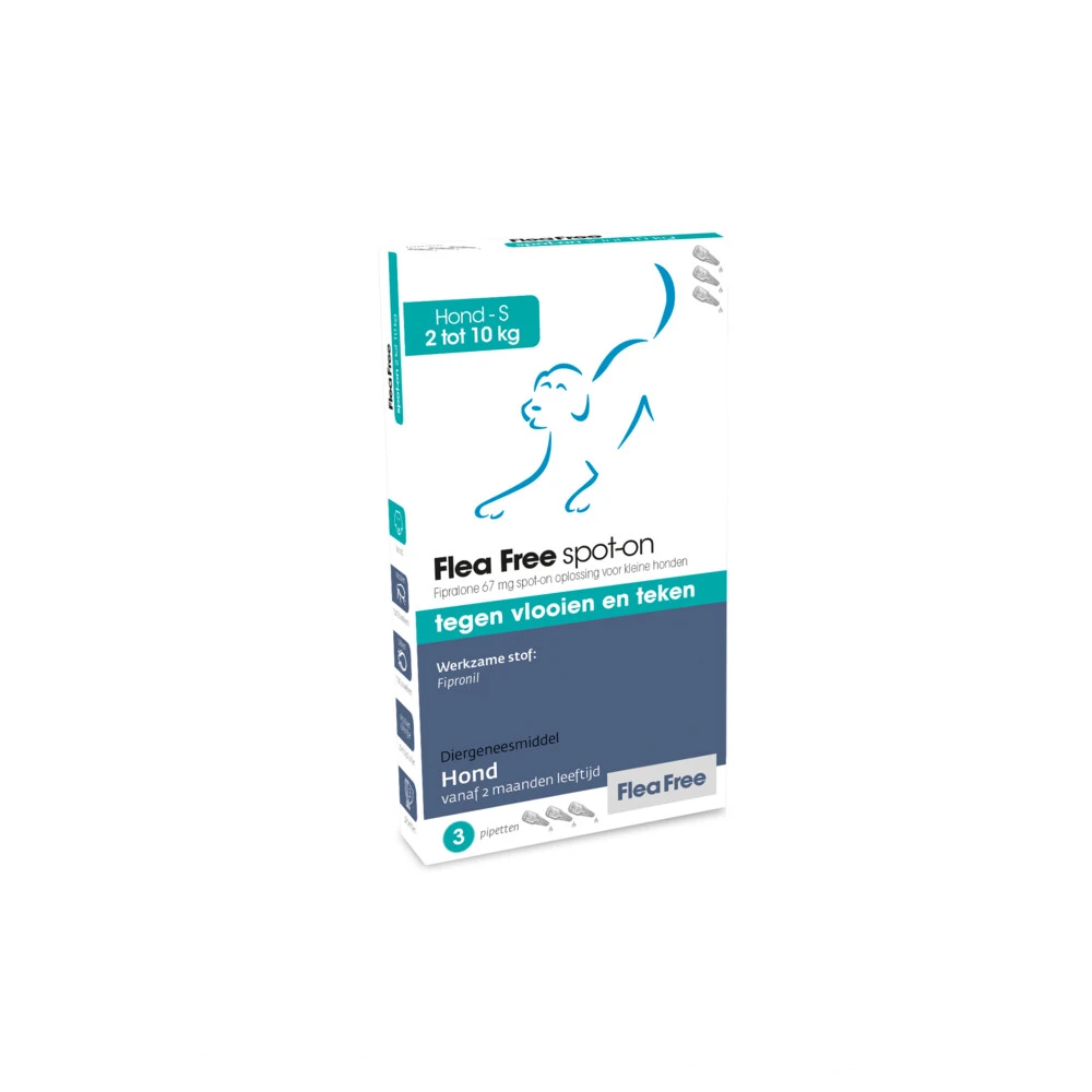 Flea Free Spot On Anti Vlooiendruppels Hond 2 – 10 kgFlea Free spot-on (voorheen Flea Free Fipralone spot-on) is een pipet met de werkzame stof Fipronil. Deze vlooienpipetten hebben dezelfde werking als Frontline spot-on. Na toediening van deze handig drop-stop pipet is je hond tot 8 weken beschermd tegen vlooien en tot 4 weken beschermd tegen teken. De werkzame stof doodt binnen 24 uur de aanwezige vlooien en binnen 48 uur de aanwezige teken. De verpakking bevat 3 pipetten, waarmee jouw hond of