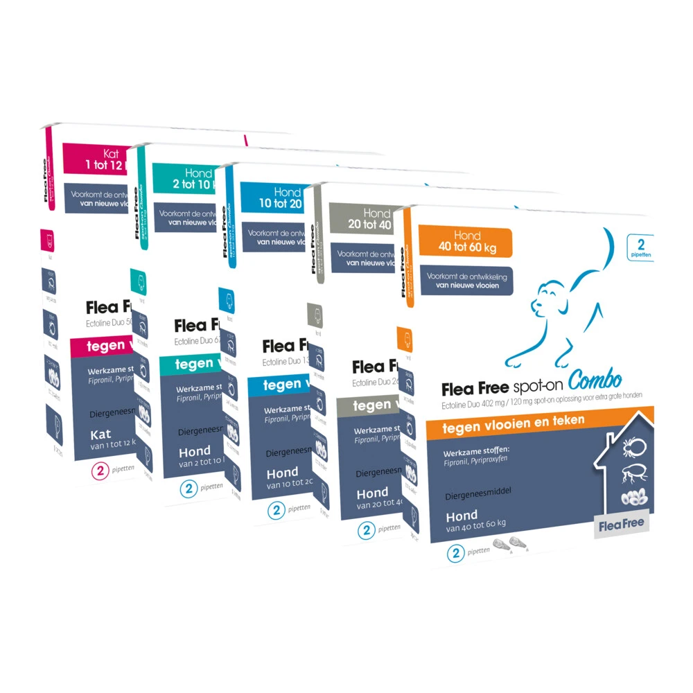 Flea Free Spot-on Combo Anti Vlooiendruppels KatFlea Free spot-on Combo (voorheen Flea Free Ectoline Duo) is een vlooien- en tekenpipet met de werkzame stoffen Fipronil en Pyriproxyfen. Deze vlooien- en tekenpipetten hebben dezelfde werking als Frontline spot-on Combo. Na toediening van deze handige drop-stop pipet is jouw kat tot 5 weken beschermd tegen vlooien en tot 1 week tegen teken. De werkzame stof Fipronil doodt binnen 24 uur de aanwezige vlooien en binnen 48 uur de aanwezige teken op he