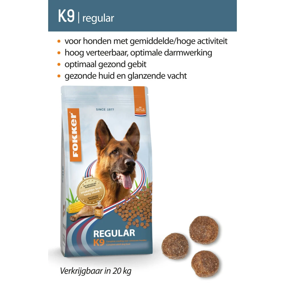 Fokker Hondenvoer Regular K9 Fokker Regular K9 is een high premium hondenvoeding voor volwassen honden met een gemiddelde tot hogeactiviteit. Dit voer is dan ook goed geschikt voor sport honden. Fokker Regular K9 bevat hoog verteerbare natuurlijke ingrediënten die je hond fit en gezond houden en is energierijke voeding. Energierijke voedingHoog verteerbaar voor een optimale darmwerkingMooi huid en glanzende vachtGezond gebit