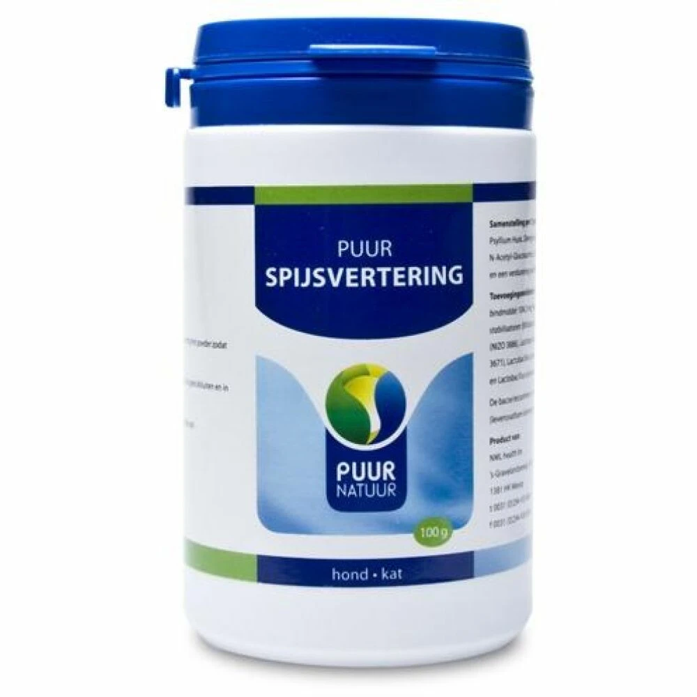 PUUR SpijsverteringVoor goed werkende darmen. Neemt overtollig darmvocht op (bij dunne ontlasting), maakt de darminhoud zachter (bij obstipatie) en is geschikt voor paard, kat en hond.PUUR Spijsvertering:Neutraliseert gifstoffen in de darmenZorgt voor goede opbouw van de darmfloraZorgt voor een optimale weerstand