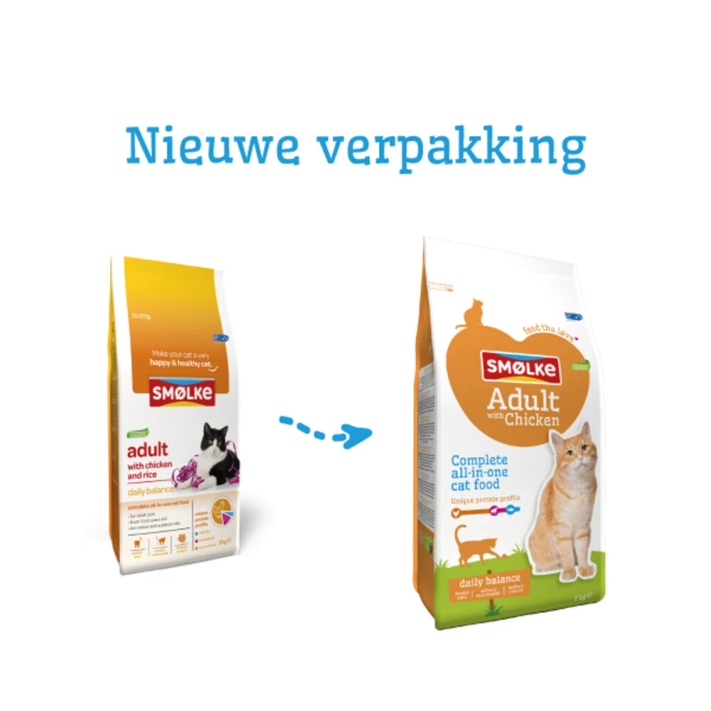 Smolke Kattenvoer Adult KipSmølke Adult with Chicken is een complete Alles-in-één kattenvoeding afgestemd op de behoefte van volwassen katten vanaf ongeveer 12 maanden. Het recept van deze lekkere en gezonde kattenbrokjes heeft als basis drie verschillende dierlijke eiwitbronnen, namelijk lam, (verse) kip en duurzaam gevangen vis. De voeding is samengesteld zonder tarwegluten en er zitten geen kunstmatige geur-, kleur- en smaakstoffen in. Smølke gebruikt ook geen chem