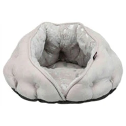 Trixie Mand Iglo FeatherTrixie Mand Iglo Feather met polyester bekleding en polyestervlies vulling met stevig geïntegreerd kussen. Velours/plucheDoorgestiktMet zilveren veertjes printSlipvaste onderkant